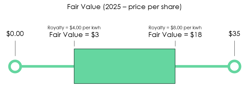 Base Case fair value between $3 & $18 (wide range due to unknown royalty pricing). Median fair value estimate is $10 per share.