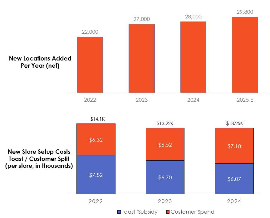 The best way to think about this is that it takes $13,250 dollars to set up a new location on the Toast network (using 2024 numbers). The customer contributes $7,180, leaving Toast with a net loss of $6,070 per store.