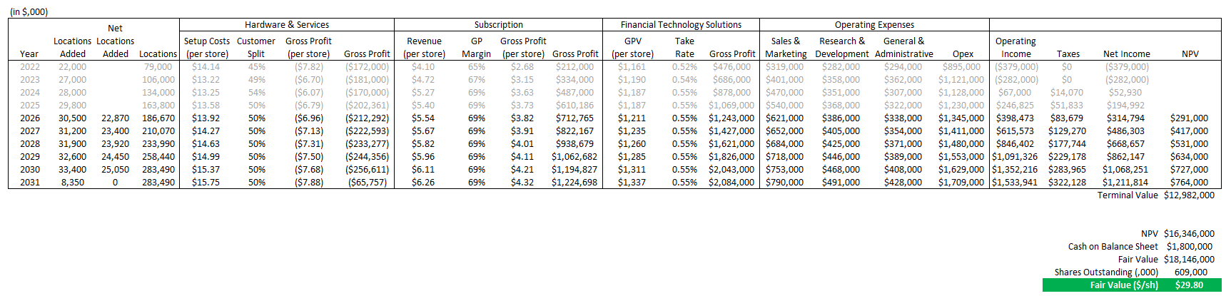 The forecast ends in 2031. I assume that their steady state growth market penetration is around 30% at just under 300k locations. Figure 8 shows the full valuation (apologies for the tiny font).