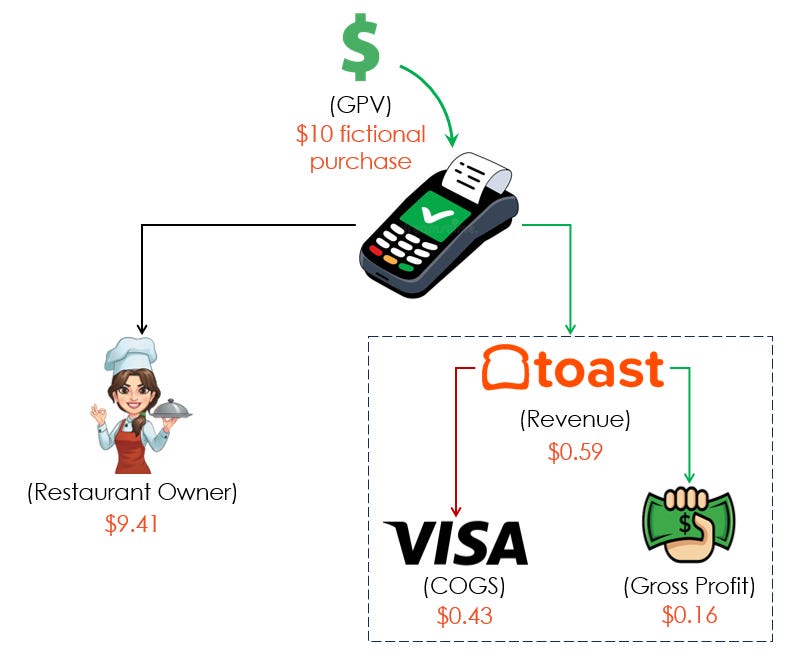 So if someone purchases a $10 burrito, something like $9.41 goes to the restaurant and 59¢ will go thru Toast (recorded as revenue). Of that 59¢, 43¢ will go to the credit card company (recorded as cost of revenue) and 16¢ will go to Toast to keep (gross profit). Note, the ratio split may not be consistent over time and will vary between customers.