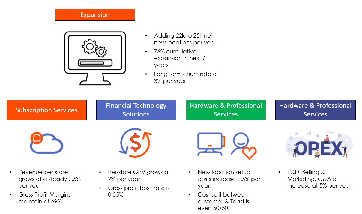My overall findings are that Toast is probably about fairly valued today (at $30 per share) using modest, but optimistic growth assumptions. However, the investment comes with additional potential upside if management succeeds in their expansion efforts.